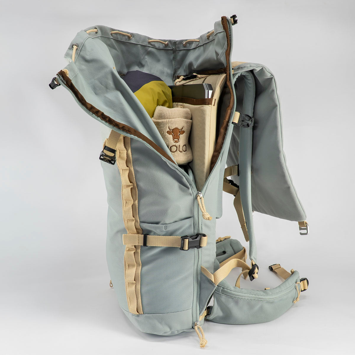 Side compression straps for gear attachment can also be closed over the front